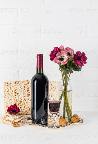 Праздничная композиция к еврейской Пасхе. Бутылка кошерного вина, маца, хрустальный бокал вина, традиционная еда для праздника