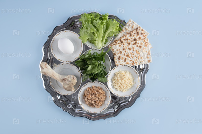 Красивое серебряное блюдо Седера с традиционными угощениями для весеннего праздника еврейской Песаха. Вид сверху. Синий фон. Место для копирования
