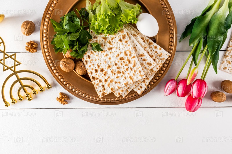 Красивый праздничный фон для еврейского праздника Песаха с традиционными угощениями и символами на белом деревянном столе. Вид сверху. Плоская планировка. граница