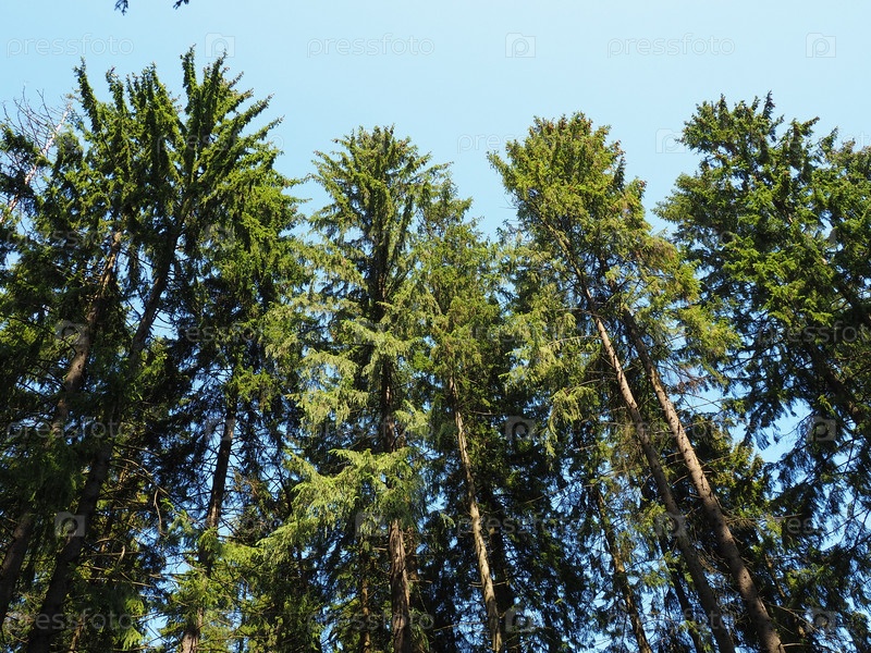 Старые высокие ели. Еловая крона. Тайга лес. Стволы, ветки и еловые иголки на фоне голубого неба