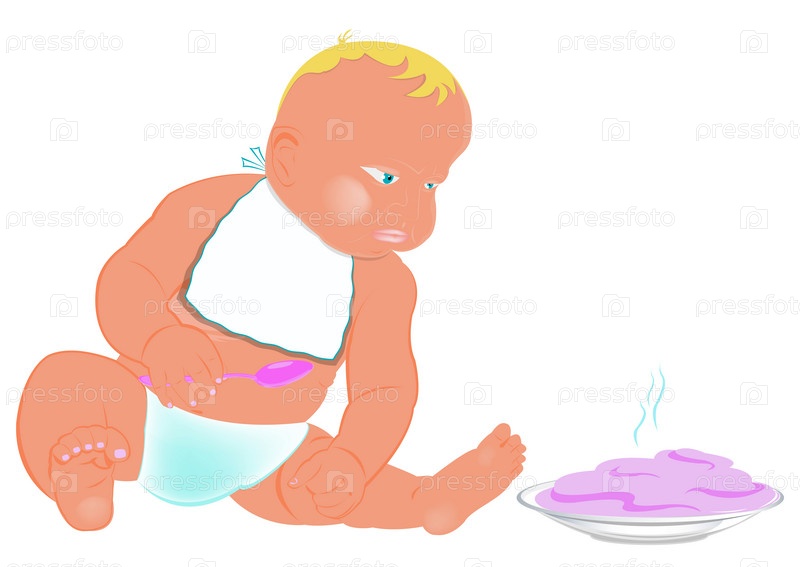Малыш с ложкой и тарелка с фруктовой кашей на белом фоне. Здоровое детское питание