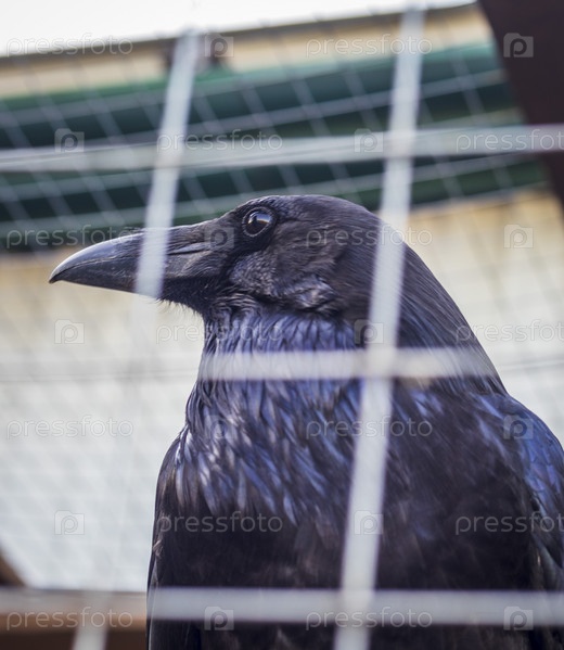 Вид вороны, сидящей в клетке. Пернатый