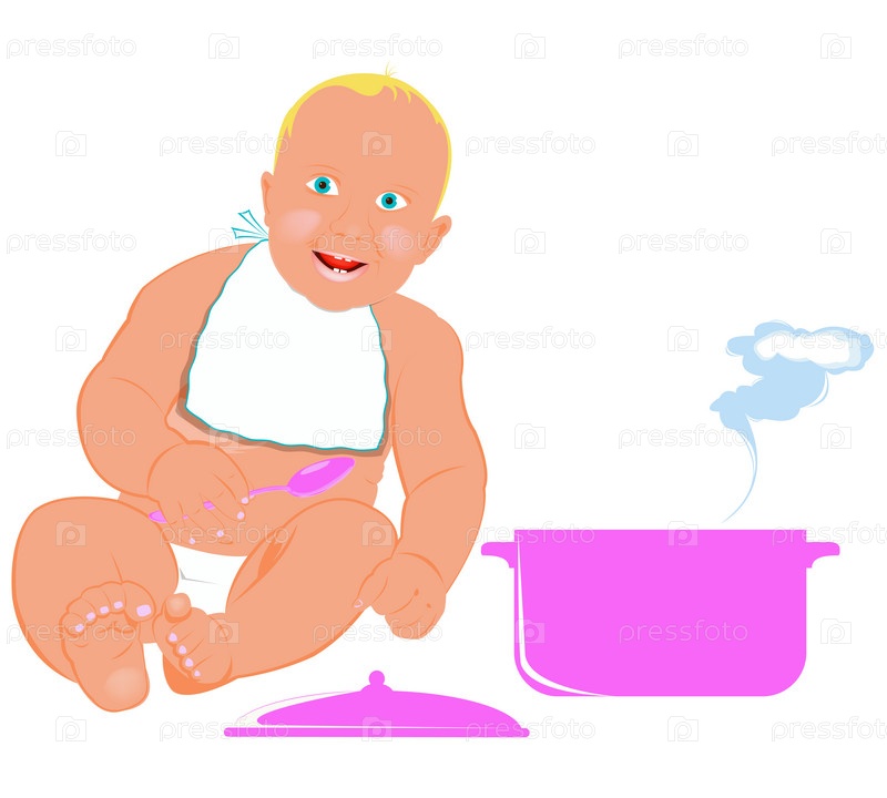Малыш с ложкой и кастрюлей на белом фоне. Здоровое детское питание