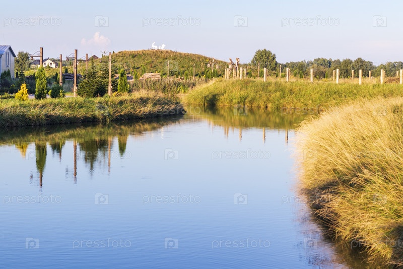 Вид красивого пруда в деревне. На открытом воздухе
