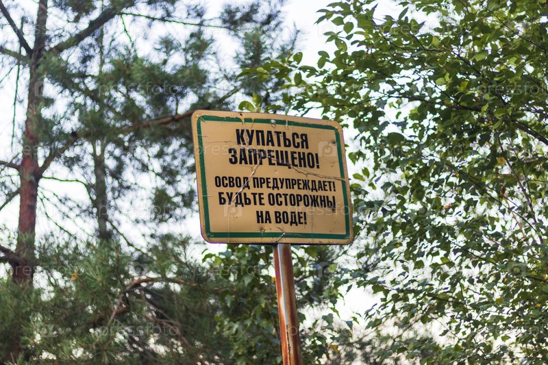 Рядом с пляжем табличка «Купание запрещено» на русском языке. Ограничение