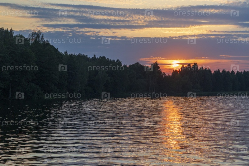 Пейзажная съемка заката у озера в лесу. Природа