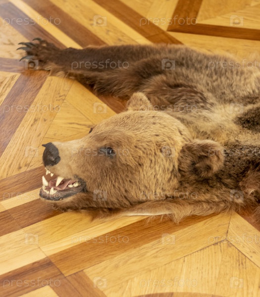 Снимок шкуры медведя в охотничьем домике дома. Декор