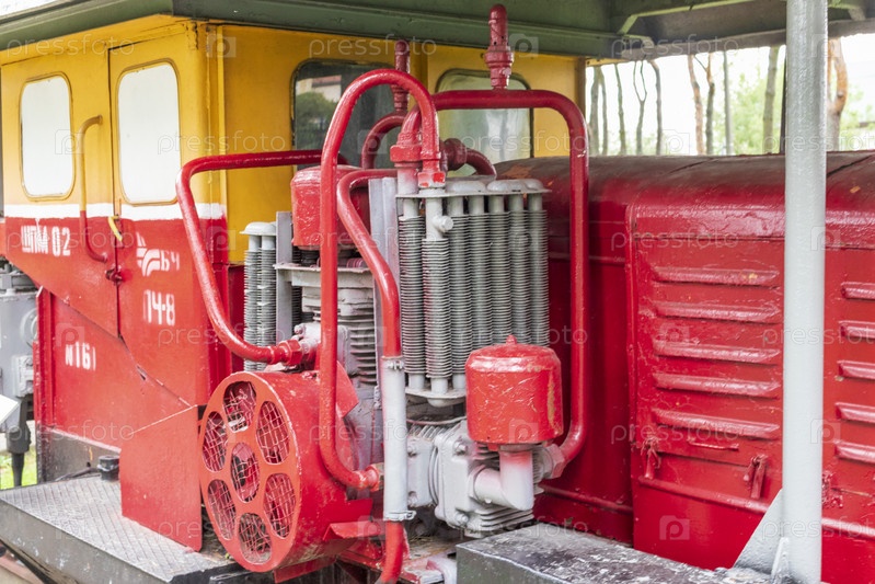 Вид старинного старого строительного поезда. Транспорт