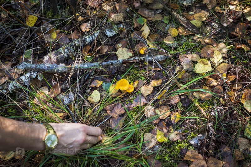 Крупный план маленькой грибной лисички в лесу. Природа