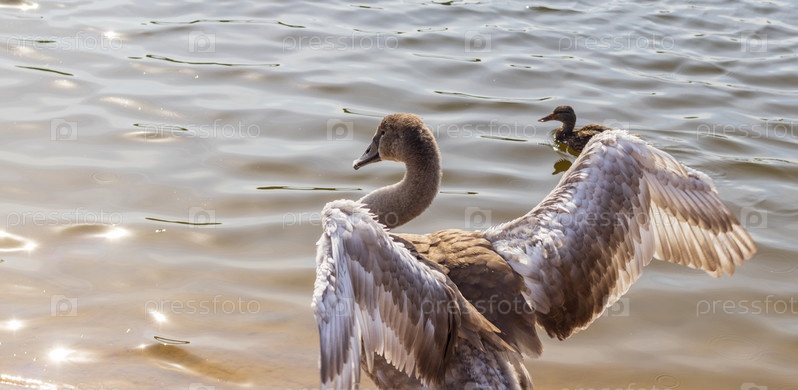 Крупный план лебедей, уток, лебедей у пруда. Пернатый
