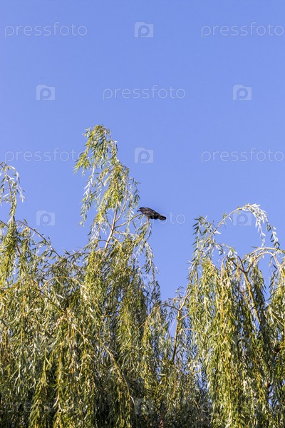 Вид вороны, сидящей на дереве. Птица