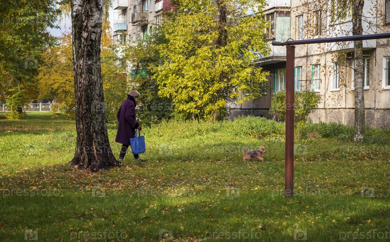 Минск, Беларусь - 14.10.2023 - Пожилая женщина выгуливает собаку на улицу. На открытом воздухе