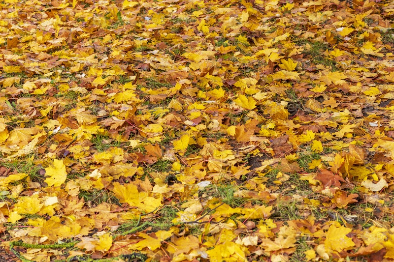 Крупный план поверхности почвы в лесу, покрытой разноцветными опавшими листьями с деревьев. Время года