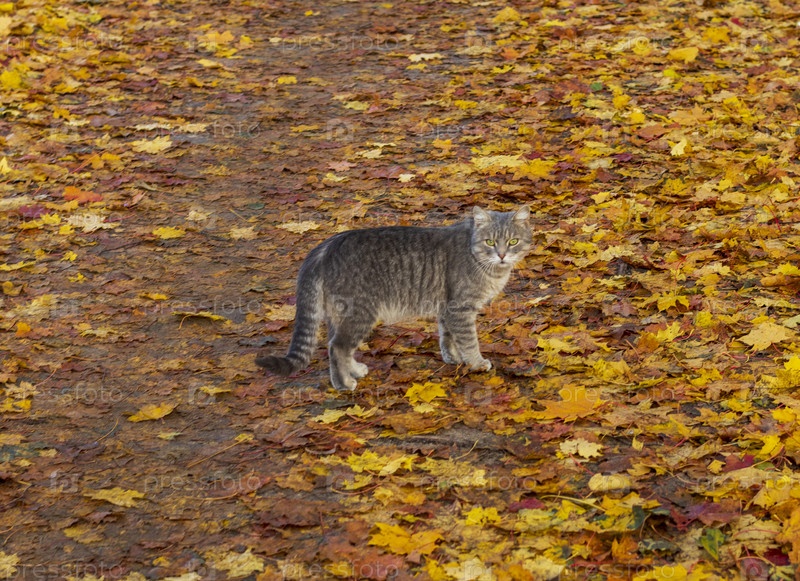 Крупный план поверхности почвы, покрытой разноцветными опавшими листьями с деревьев. Кот ходит по нему. Время года