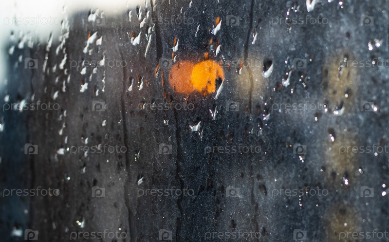 Снимок окна после дождя с размытыми огнями на заднем плане. Концепция