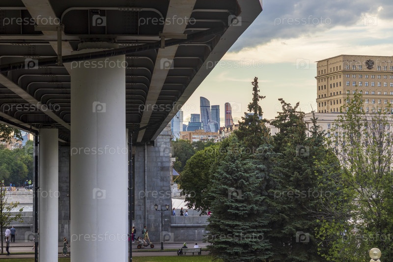 Москва, Россия - 07.09.2023 - Люди проводят день в парке Горького. Деловой район на заднем плане. На открытом воздухе