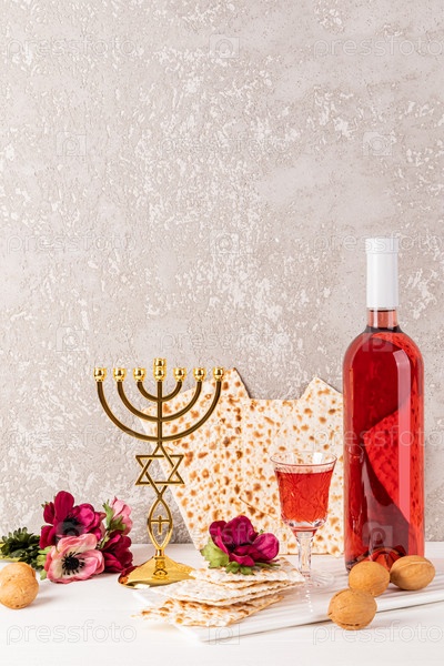 Праздничная композиция к еврейской Пасхе. Бутылка кошерного вина, маца, хрустальный бокал вина, традиционный золотой подсвечник-менора