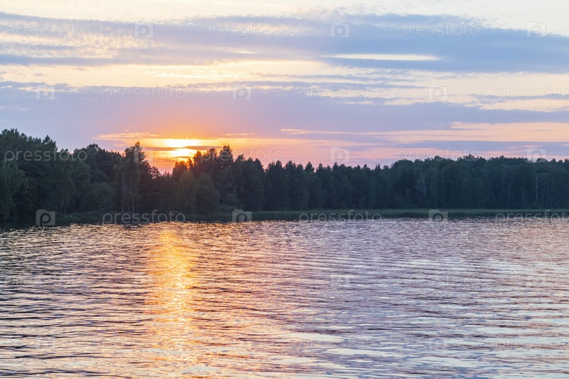 Пейзажная съемка заката у озера в лесу. Природа