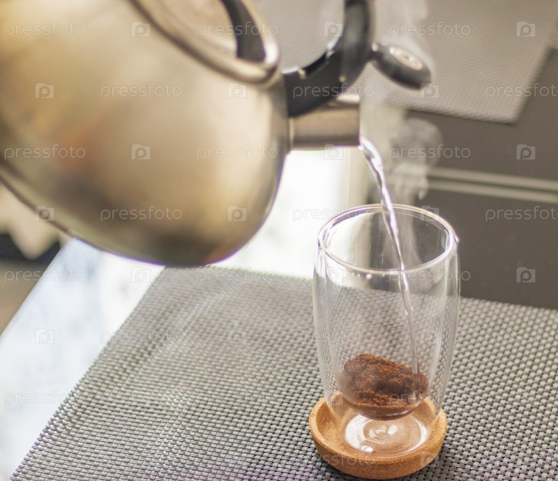 Снимок горячей воды, налитой в прозрачную чашку для заваривания кофе. Напиток