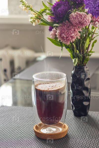В прозрачную чашку наливают горячую воду, чтобы заварить кофе. Напиток