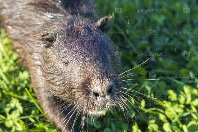 Вид ондатры на берегу реки. Животное