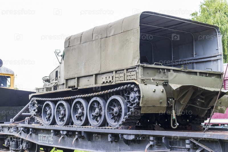 Снимок винтажного старого строительного поезда, перевозящего военную грузовую машину. Война