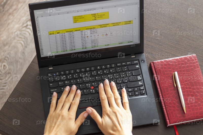 Снимок женщины, работающей на ноутбуке и показывающей на экране лист Excel с таблицей погашения банковского кредита