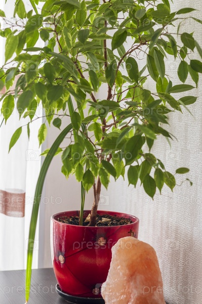 Крупным планом горшок с домашним растением и соляная лампа на верхней части комода. Концепция
