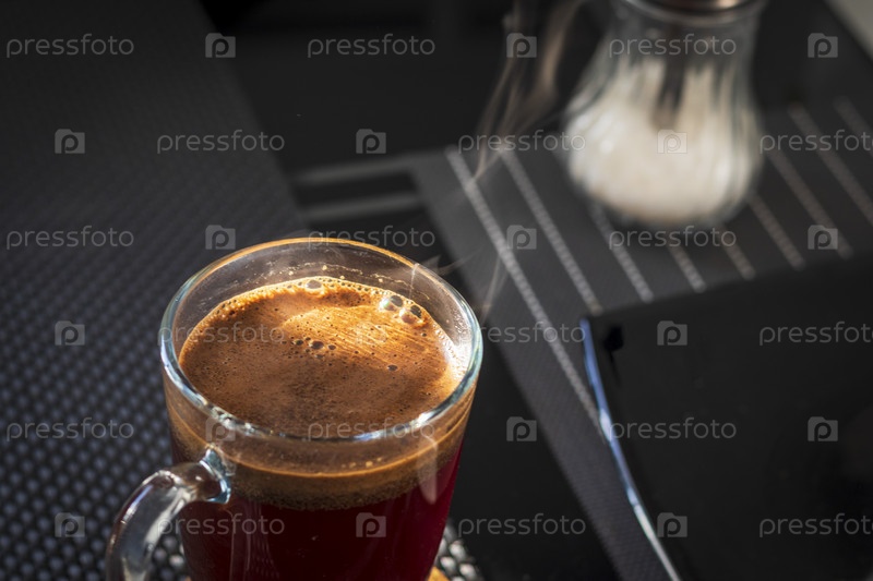 Снимок горячего кофе в прозрачной чашке. Напиток