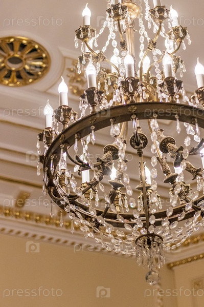 Крупный план декоративных стен, потолка и люстры. Интерьер