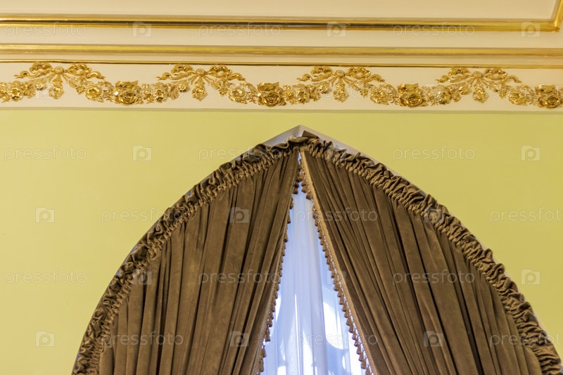 Крупным планом декоративные стены, потолок и шторы. Интерьер