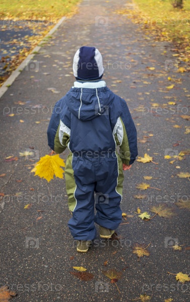 Снимок маленького ребенка в комбинезоне, гуляющего по парку с разноцветными осенними листьями. на открытом воздухе