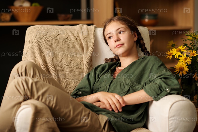 Милая безмятежная девочка-подросток в повседневной одежде отдыхает в удобном кресле