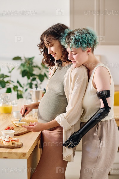 Молодая женщина-инвалид обнимает свою беременную девушку на кухне