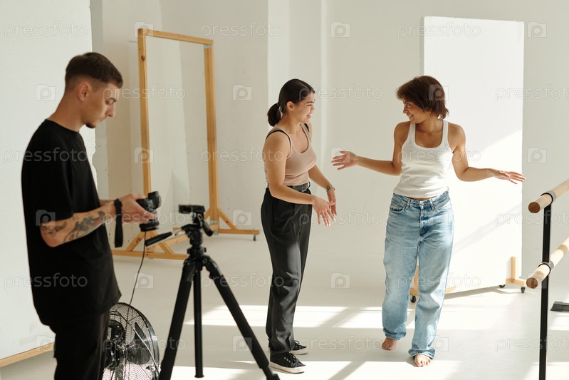 Сосредоточьтесь на двух счастливых молодых межкультурных женщинах в повседневной одежде, обсуждающих позы