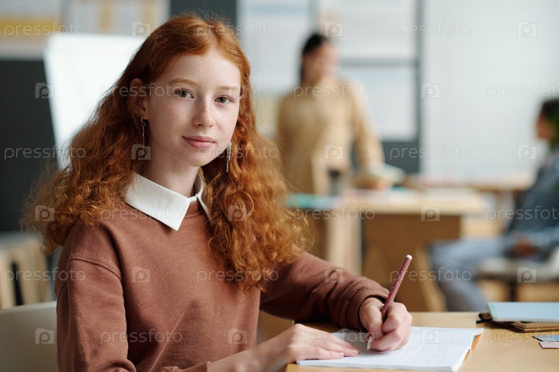 Молодая девушка с ручкой в руке смотрит на камеру, сидя у стола