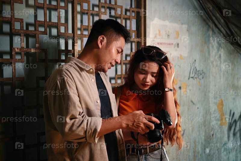 Мужчина показывает девушке фотографии после стрельбы