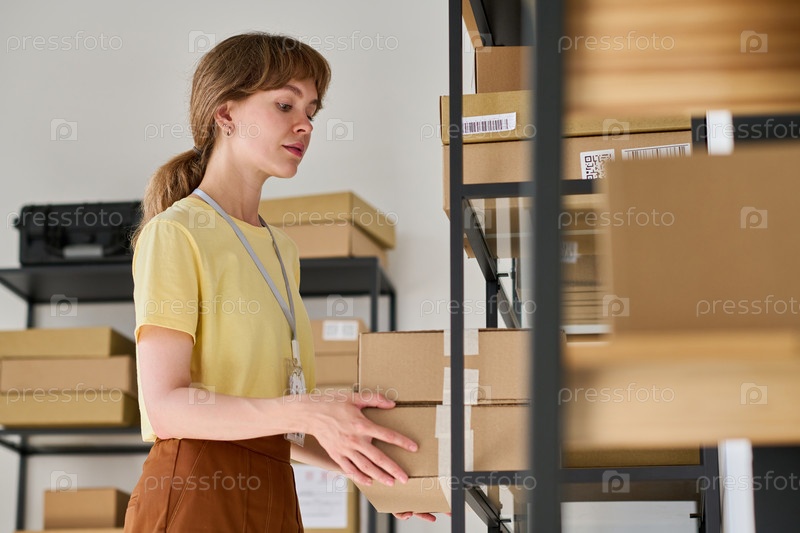 Молодая женщина в желтой блузке кладет коробки на стойку на складе