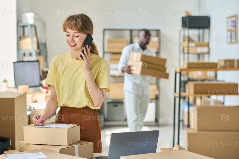 Молодая улыбающаяся менеджерка склада, разговаривающая по мобильному телефону