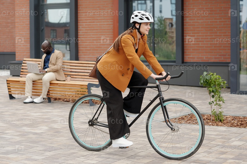Боковой вид стильной молодой бизнес-леди, сидящей на велосипеде и едущей на работу