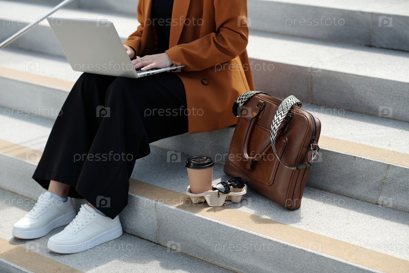 Обрезанный снимок молодой стильной женщины-цифрового кочевника, печатающей на клавиатуре ноутбука