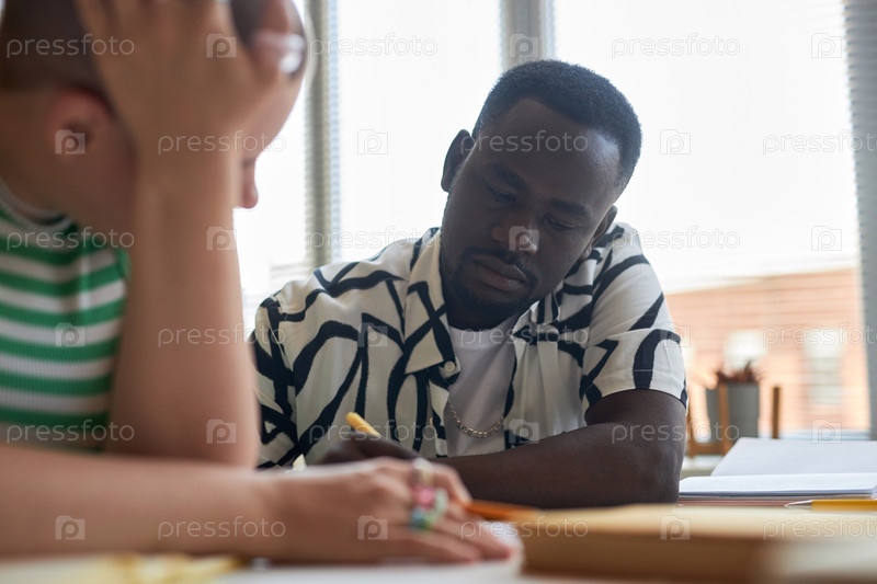 Серьезный молодой человек смотрит на свои заметки, обсуждая их со своим одноклассником