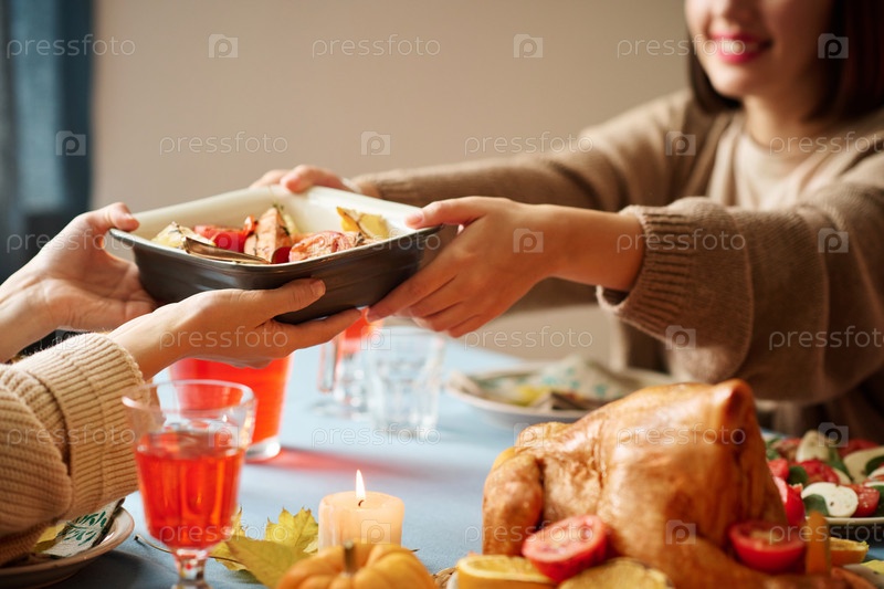 Женщина дарит своей подруге поднос с едой на празднике Благодарения