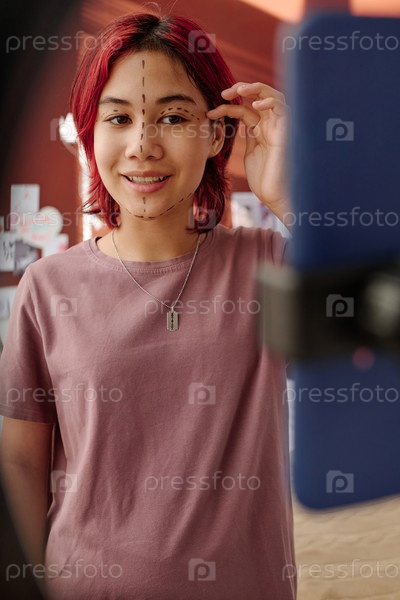 Улыбающаяся подростковая женщина-влиятельница касается левого храма