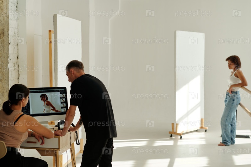 Два молодых коллеги в повседневной одежде обсуждают новые снимки на экране компьютера