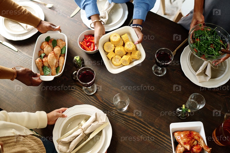 Выше угол рук членов семьи, ставших домашнюю еду на стол