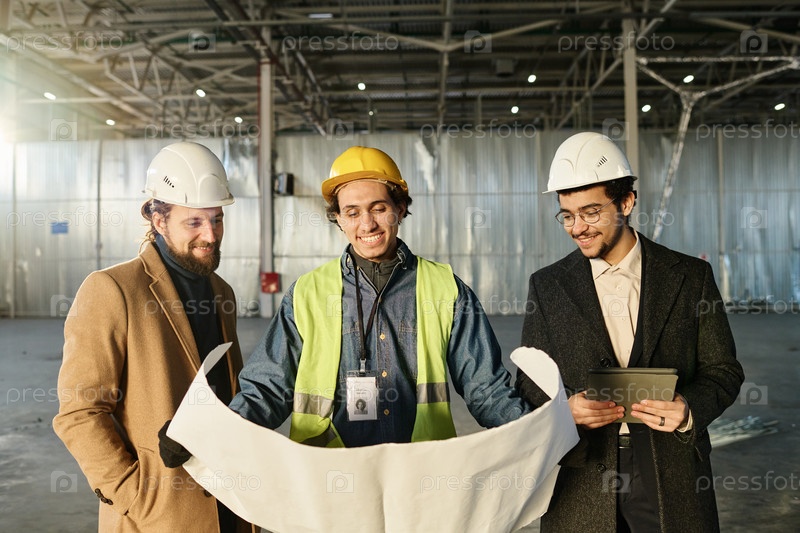 Группа счастливых молодых архитекторов в защитных шлемах, смотрящих на эскиз