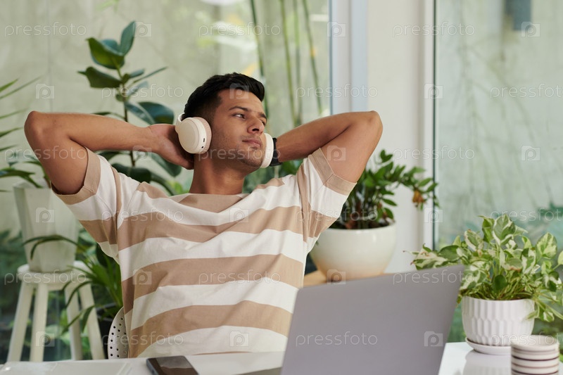 Молодой спокойный мужчина в наушниках и повседневной одежде смотрит в сторону через окно