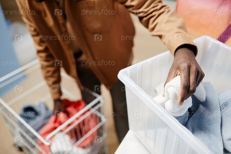 Рука молодого человека, кладущего белую футболку в пластиковый контейнер