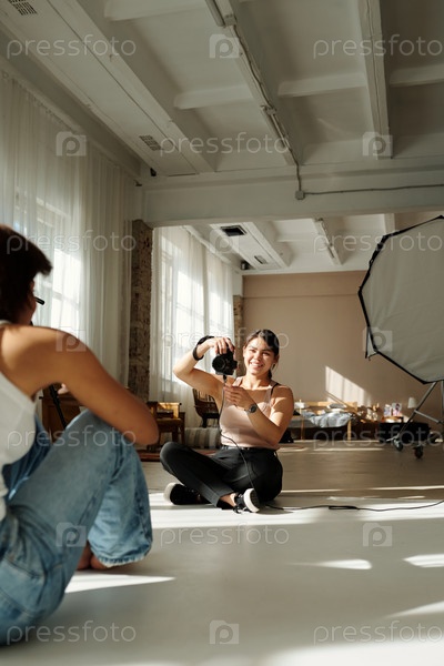 Счастливая молодая женщина-фотограф с фотоаппаратом сидит на полу